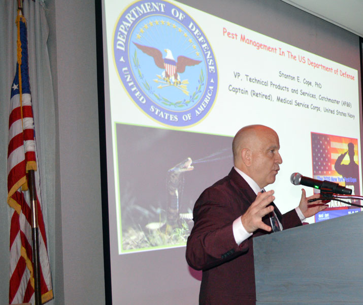 Andy Linares, President of Bug Off Pest Control Center, talks to attendees about honoring warriors in the U.S. armed forces and our first responders during his introduction at the 2019 New York Pest Expo. PHOTO: MARTY WHITFORD