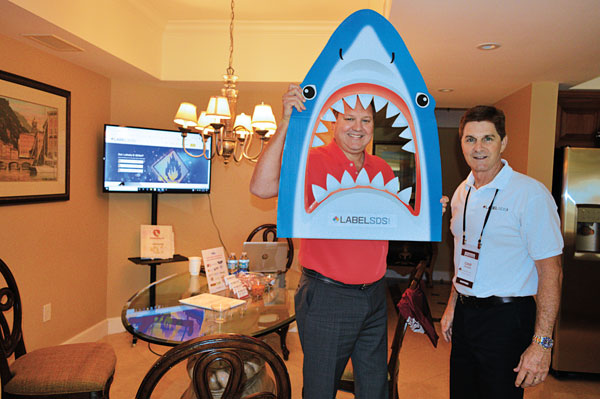 Chip Hughes, right, co-owns LabelSDS.com with his wife, Debbie. The pair went all in on branding their meeting room suite with a “Be a Business Shark” theme, replete with Debbie’s delicious “shark bait” snack mix, shark beverage cozies and the sharkhead cutout that the game Jerry Smith, Dial Pest Control, is pictured using. PHOTO: PMP STAFF