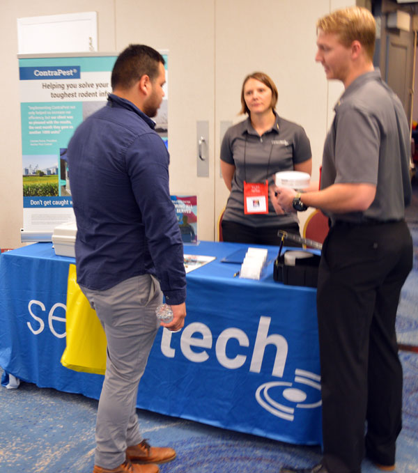 Senestech’s Brandy Pyzyna, VP scientific operations along with Cameron Rains, Field Application Specialist, share insights about ContraPest with an attendee at the 2019 New York Pest Expo. PHOTO: MARTY WHITFORD