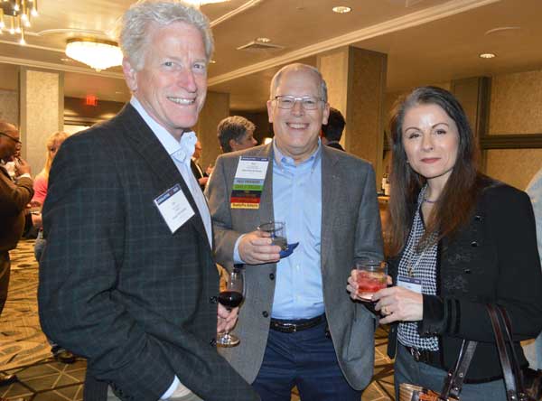 Alfie Treleven of Sprague Pest Solutions, Russ Ives of Rose Pest Solutions and Dr. Cisse Spragins of Rockwell Labs (pictured from left to right) catch up at the Legislative Day Welcome Reception. PHOTO: PMP STAFF