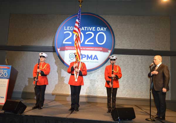 A color guard stands by as Rose Pest Solutions’ Russ Ives sings “The Star-Spangled Banner” before lunch is served. PHOTO: PMP STAFF
