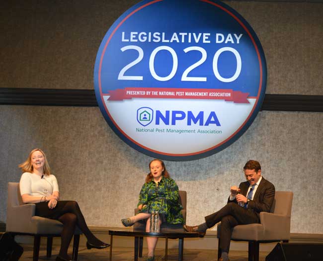 Politico journalists Anna Palmer (left) and Jake Sherman (right) participated in a friendly political debate moderated by the NPMA’s Ashley Amidon, center. PHOTO: PMP STAFF