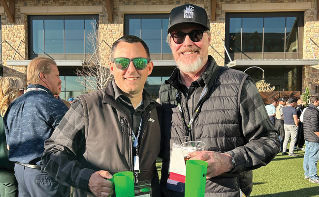 Passing the torch: Lance Platt, left, the new senior market manager for MGK’s professional business, enjoys PestFest alongside his predecessor, Brian Krelitz — celebrating the transition with smiles and laughter. PHOTO: MGK