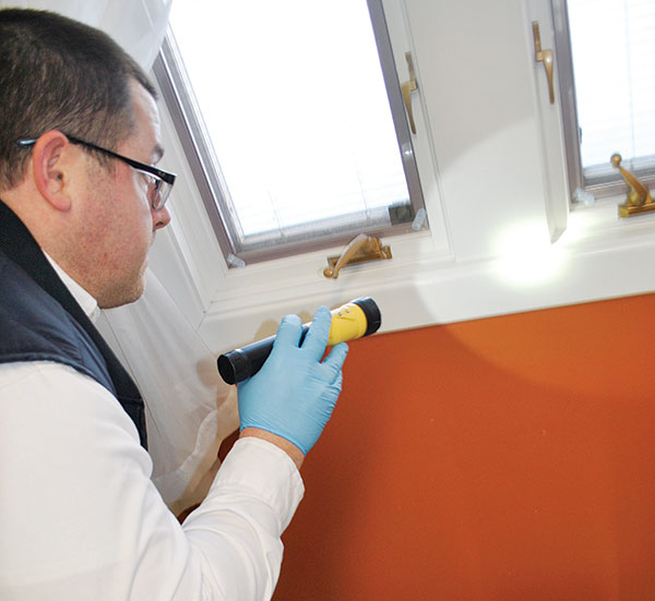 Lastafka practices due diligence by thoroughly inspecting potential trouble areas around the windows of a bathroom near the kitchen. Photo: Will Nepper
