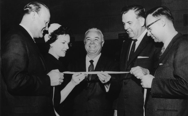 Representatives at the initial listing of Rollins Inc. on the American Stock Exchange a few years before the company was listed on the NYSE. From left are John W. Rollins, Madalyn Copely, American Stock Exchange employee, O. Wayne Rollins, and Henry Tippie. PHOTO: ROLLINS INC.