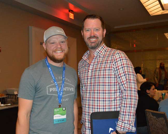 Blake Hardy and Jeff Burns of Preventive Pest Control in Las Vegas meet up at the ServSuite University reception. PHOTO: DIANE SOFRANEC/PMP