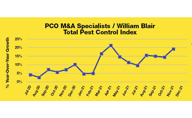 The William Blair/PCO M&A Specialists Pest Index tracks the monthly performance of 159 different privately held pest control companies located across 31 states with combined 2021 revenue of more than $400 million. This report, which is published every month, can be used by pest management professionals (PMPs) to track the monthly performance of several different U.S. pest markets, including residential, commercial, termite and bed bug. The Pest Index is built upon several years’ worth of thousands of monthly data points that have been reconciled by PCO Bookkeepers.