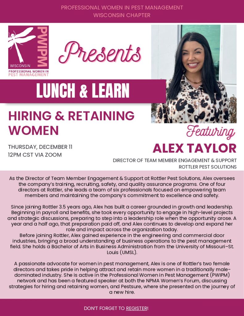 WI PWIPM is back with Lunch and Learns throughout the winter months. The first session will take place on Thurs. Dec.11, 2025, at 1 P.M. Eastern via Zoom. Kicking us off is Alex Taylor with Rottler Pest Solutions! Alex will be sharing her knowledge on hiring and retaining women in the pest management industry.